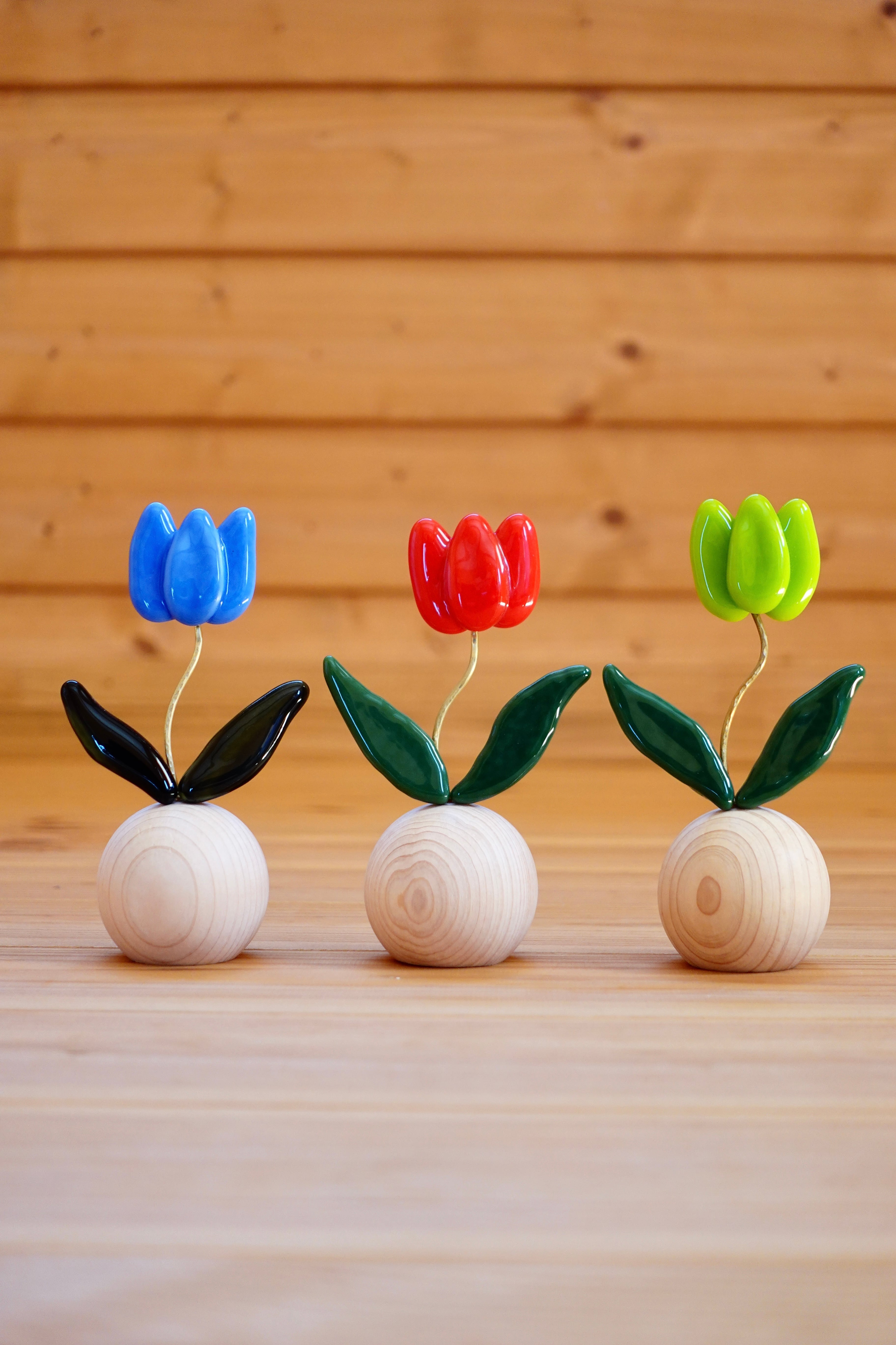 ※青色チューリップの葉っぱ部分には、グラデーションカラーのガラスを使用しています。
